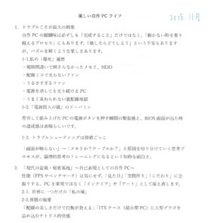 これまでに10台以上のPCを自作してきた経験を基に、パソコンを自作する醍醐味を語ってくれました。以下はそのレジュメです。