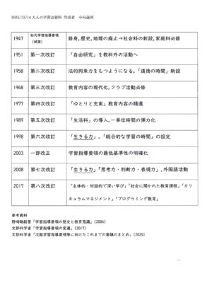 「学習指導要領」はよく耳にしますが(目にしますが)、その内容を時系列で追いながら説明を受けたのは初めてで、大変勉強になりました。